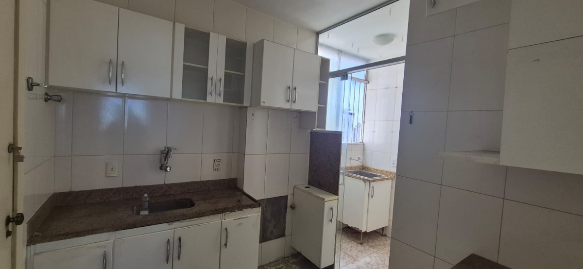 Apartamento com três quartos com armários sendo um com suite, sala para dois ambiente em L, banho social com box de vidro e armário, cozinha com armários, área de serviço e dce.